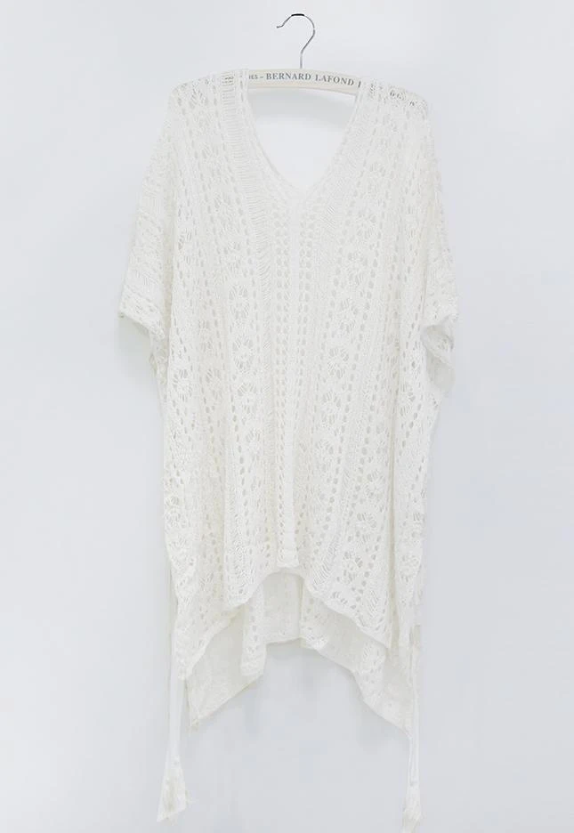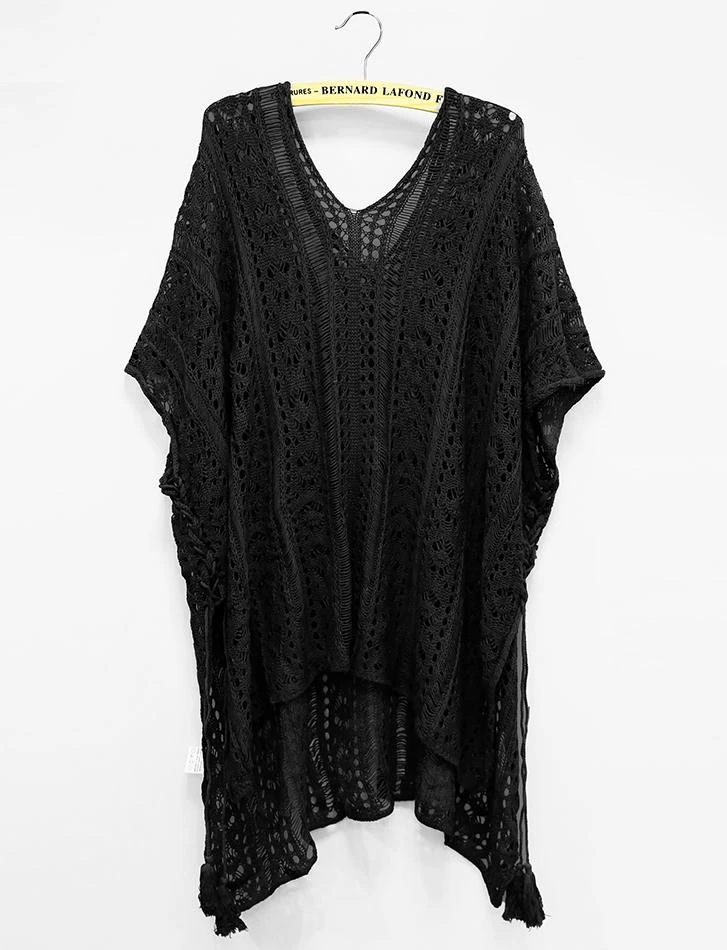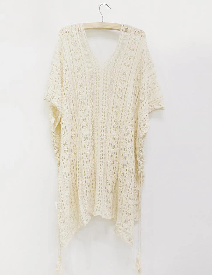 Produktdetails: Beach Tunika Cover-Up. Crochet Style Bohemian Fashion für Strand. Bikini Cover-Up Damen. Feinstrick Shirt Kleid mit Schlitz auf der Seite und Zotteln.