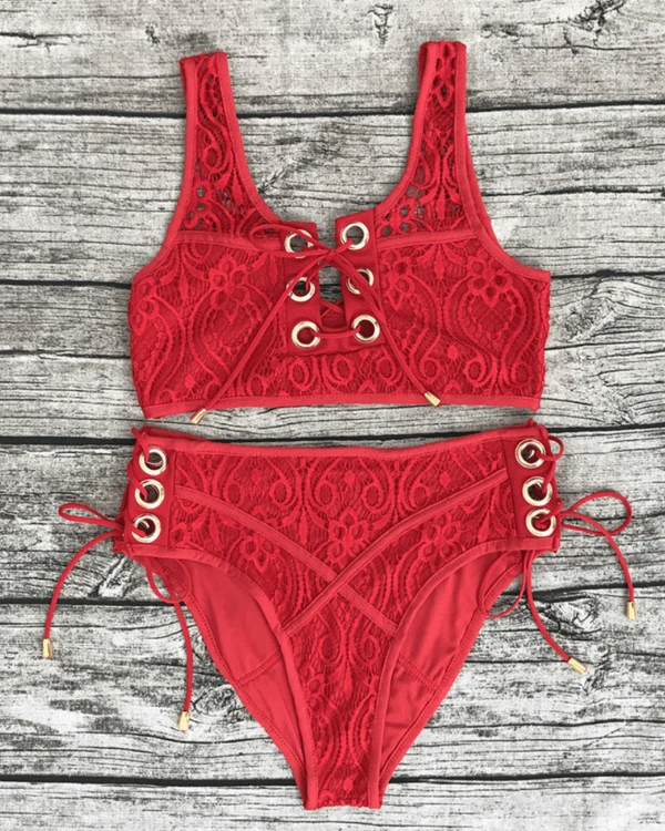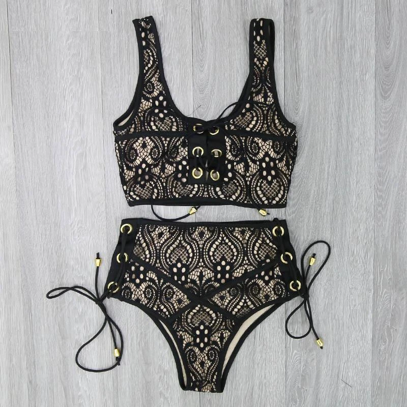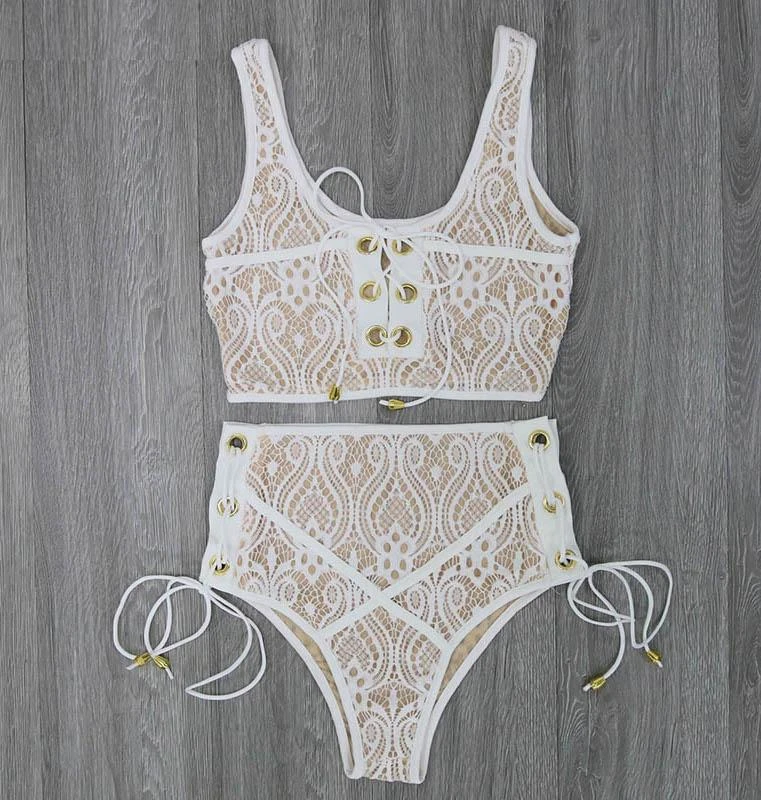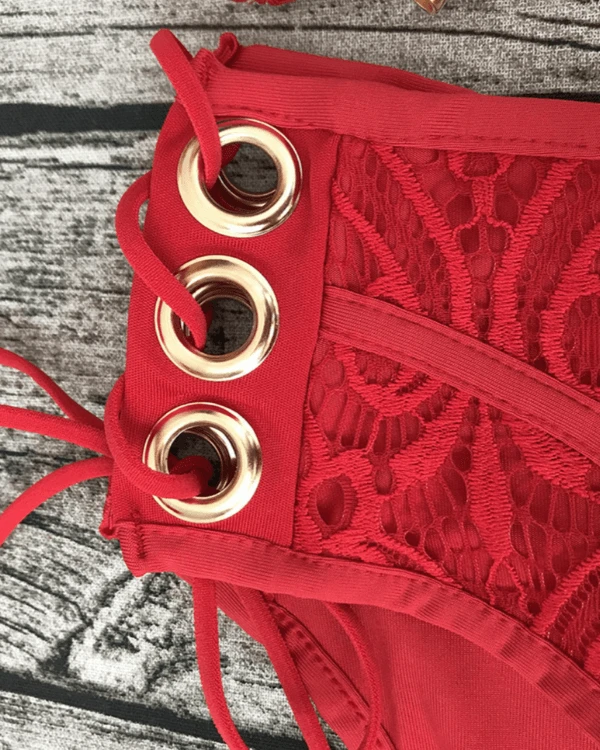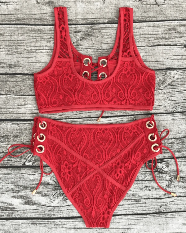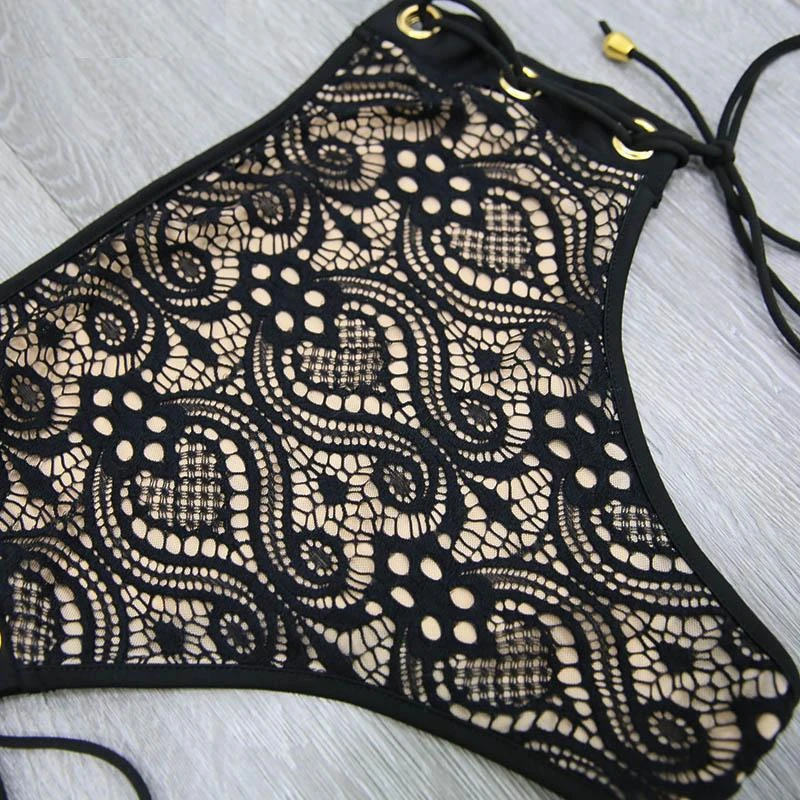 Produktdetails: Bikini Ober- und Unterteil. High-Waisted Bikini aus Spitzen / Lace und zum Schnürren auf der Vorderseite vom Oberteil.