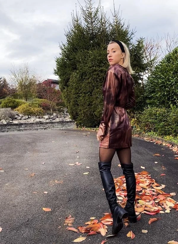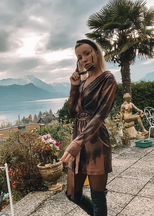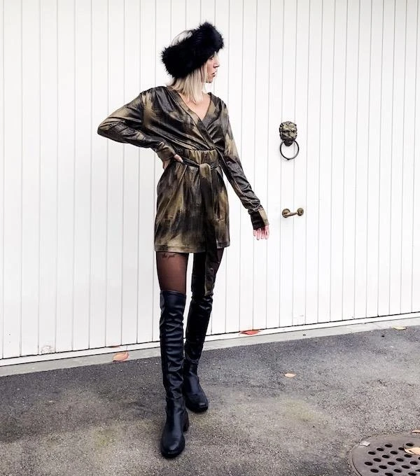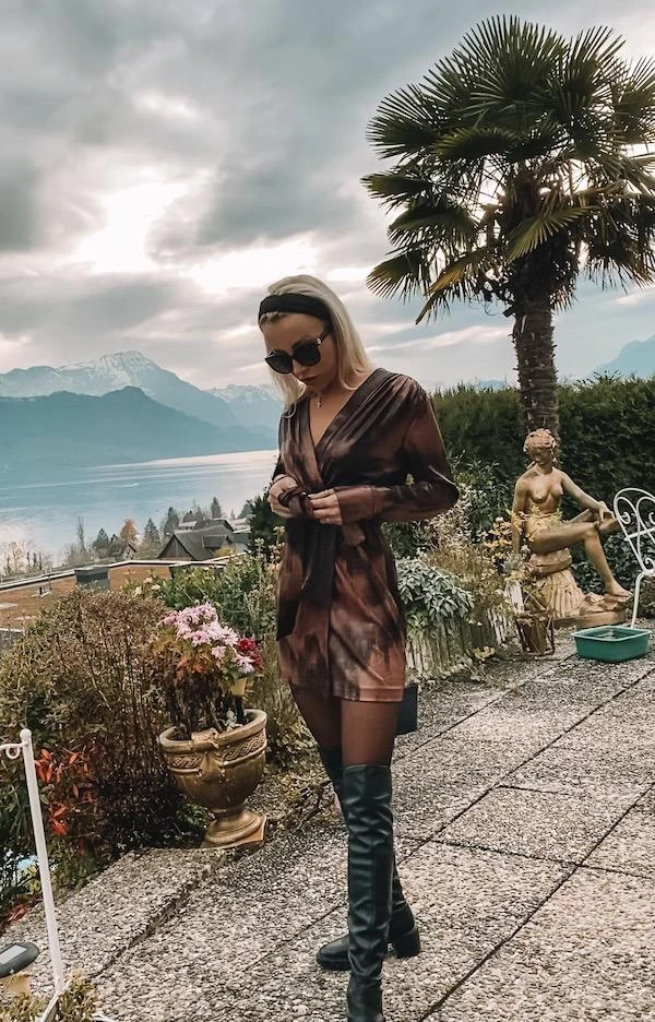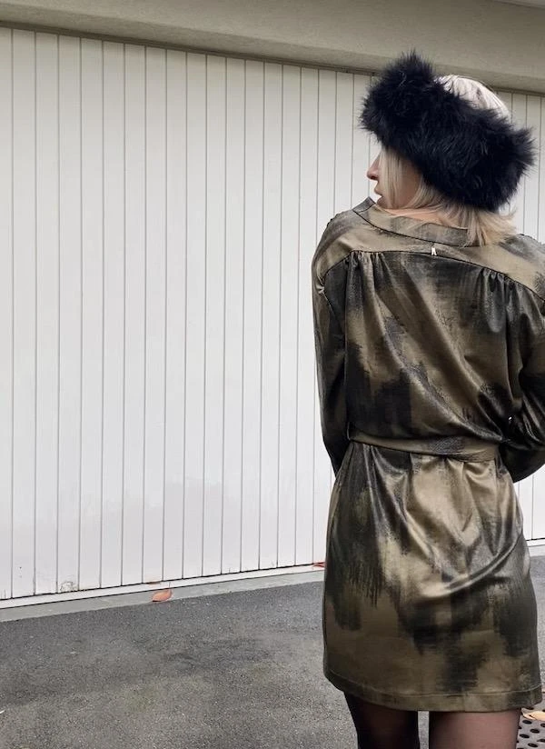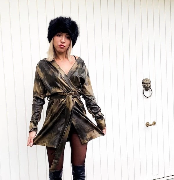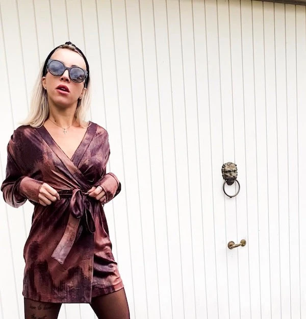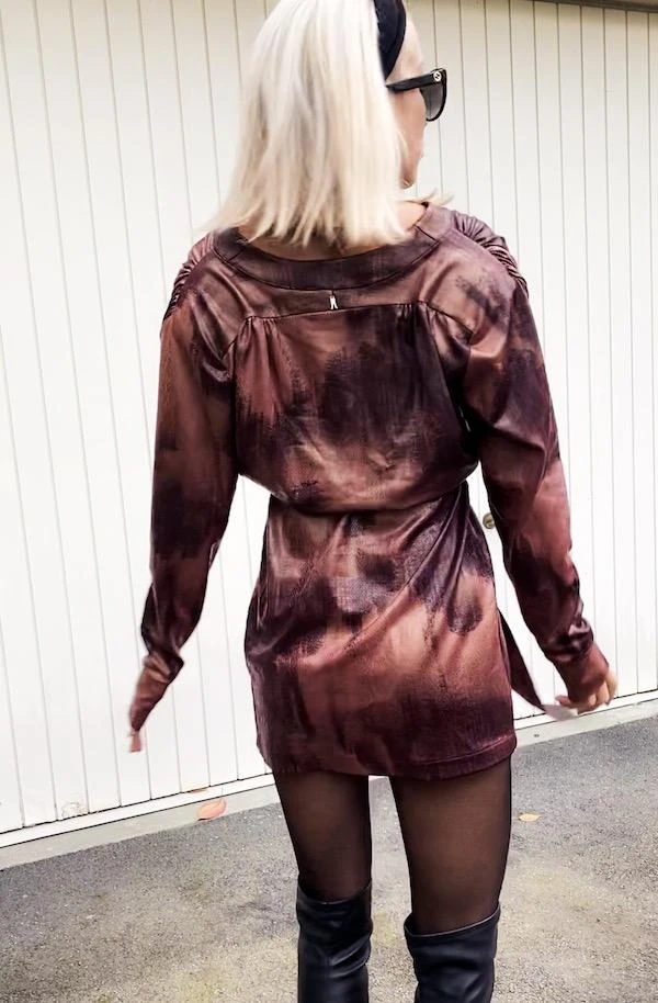 - Produktdetails: Kleid im Wickel Look mit Gürtel auf Taillen Höhe zum Binden. Spezieller Stoff im Glanz Schlangen Print Look. Bohemian Tie Dye Farbverlauf.