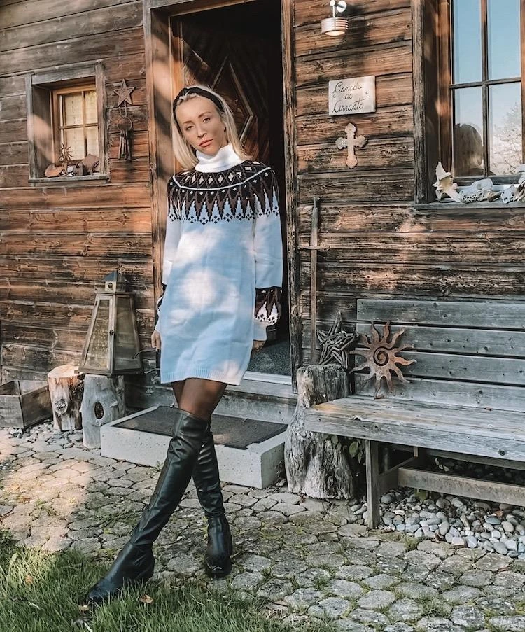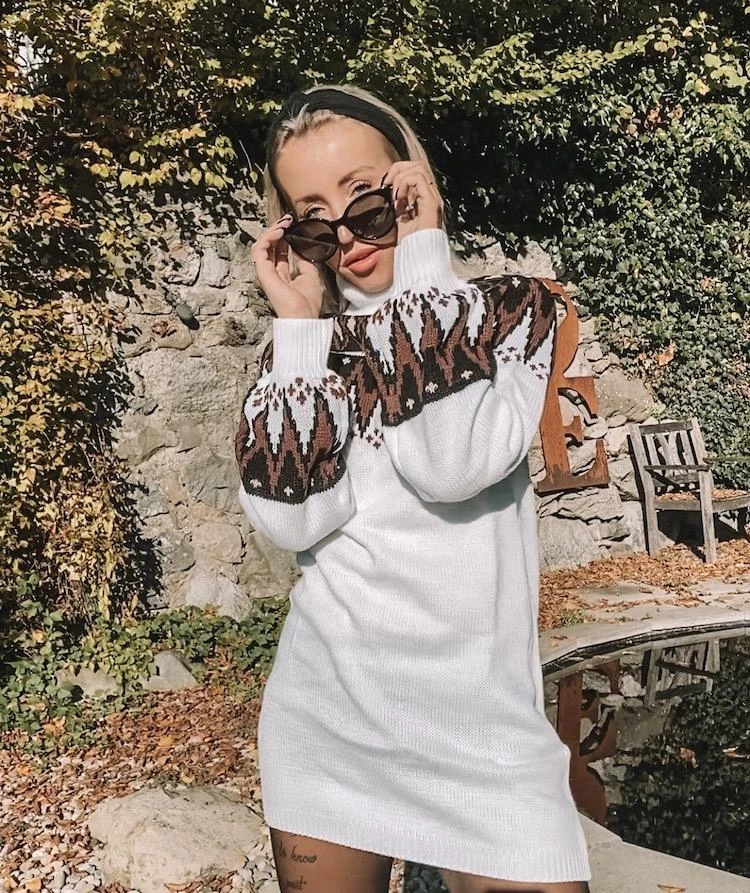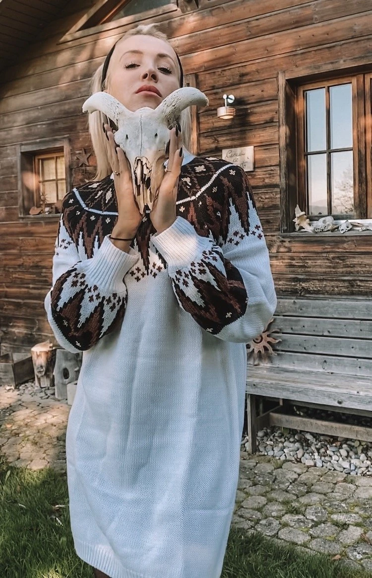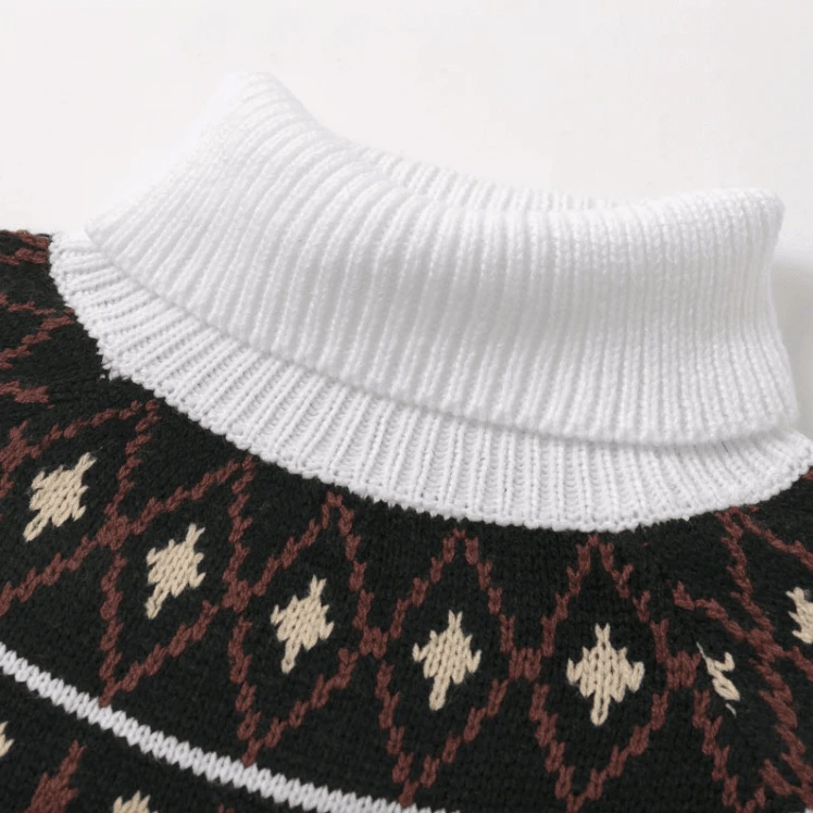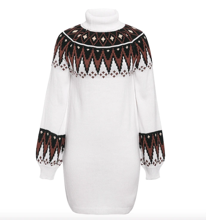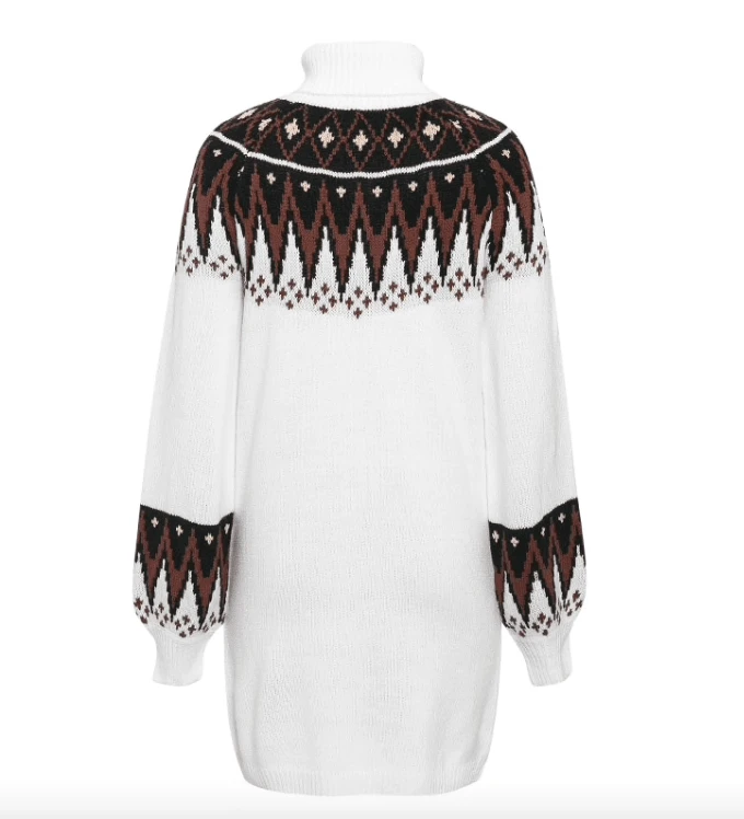 Produktdetails: Langer Winter Bohemian Rollkragen Pullover. Pullover Kleid mit Rollkragen und gestrickten Mustern.